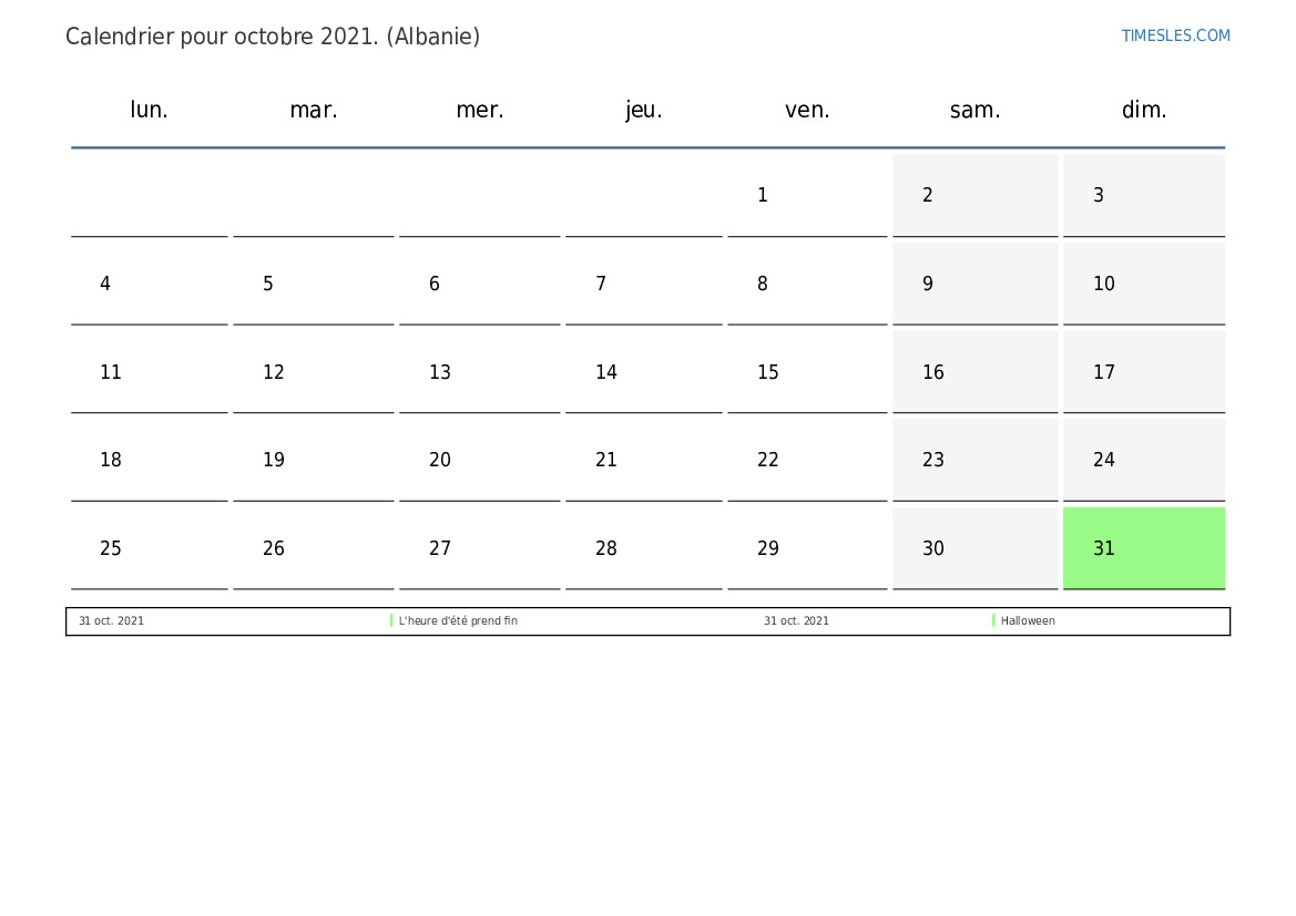 Calendrier des jours fériés et week-ends de octobre 2021 pour l'Albanie