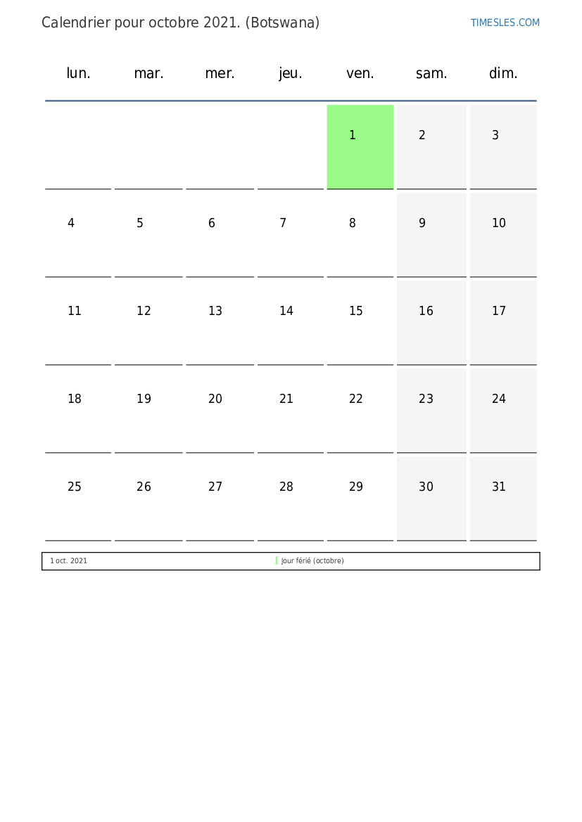 Calendrier des jours fériés et week-ends de octobre 2021 pour le Botswana