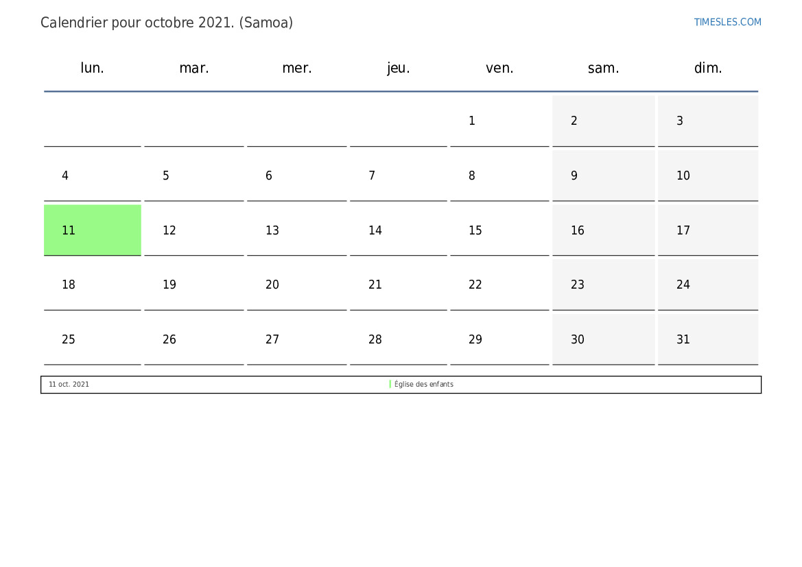 Téléchargez et imprimez le calendrier PDF avec jours fériés et week-ends de octobre 2021 pour Samoa
