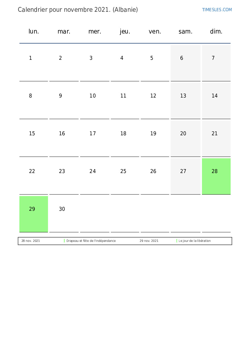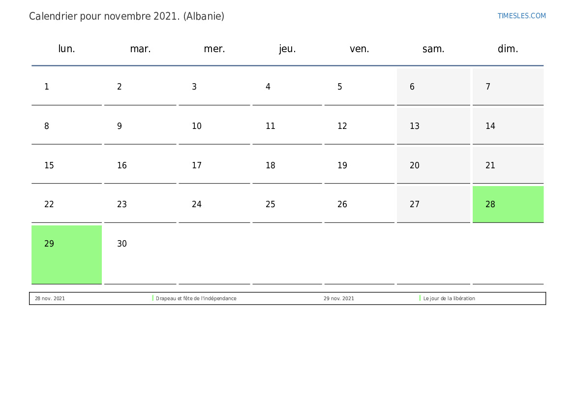 Calendrier des jours fériés et week-ends de novembre 2021 pour l'Albanie