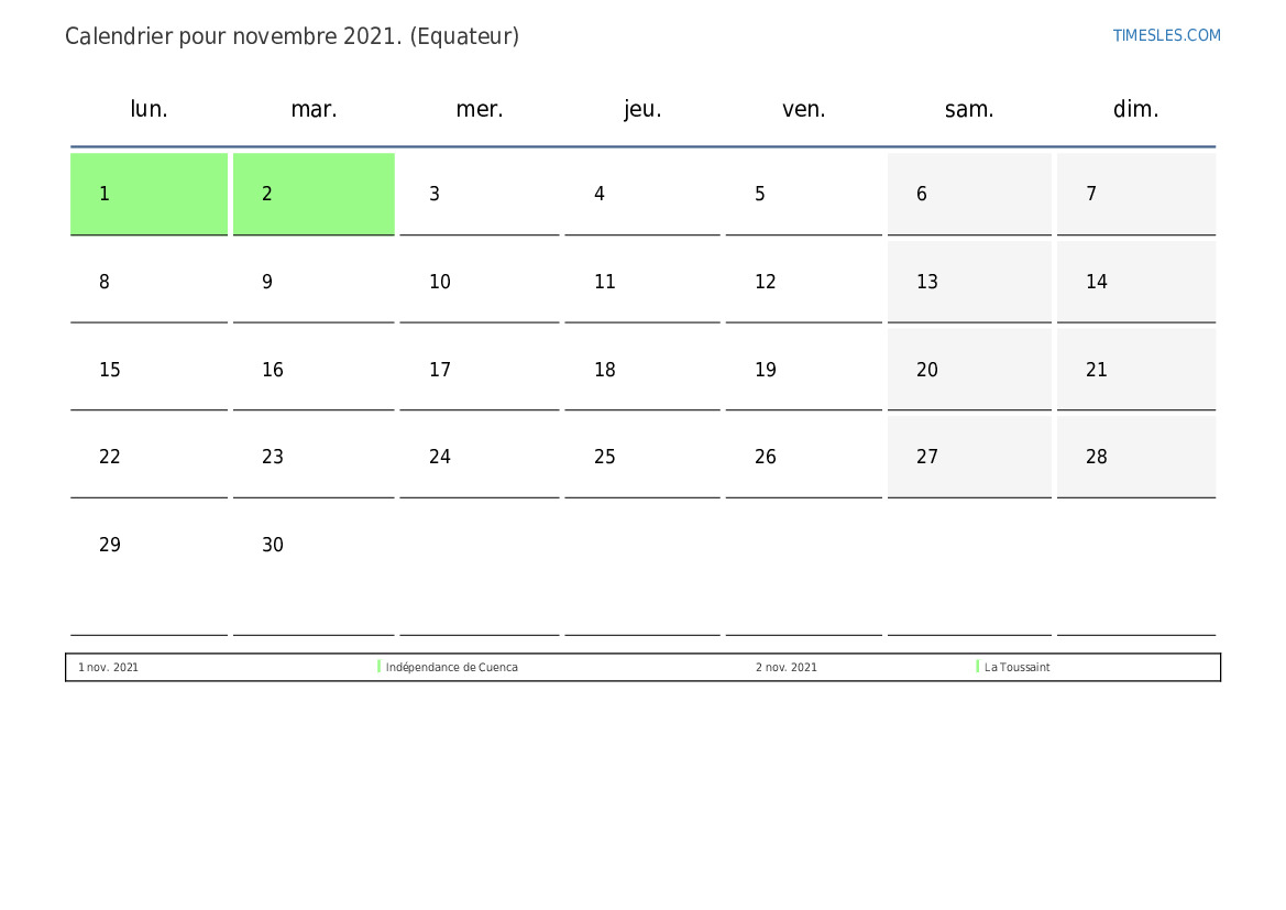 Calendrier des jours fériés et week-ends de novembre 2021 pour l'Équateur