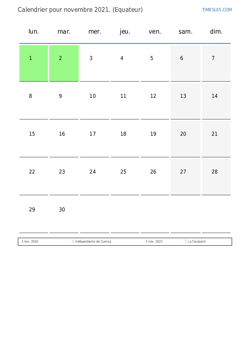 Téléchargez et imprimez le calendrier PDF avec jours fériés et week-ends de novembre 2021 pour l'Équateur