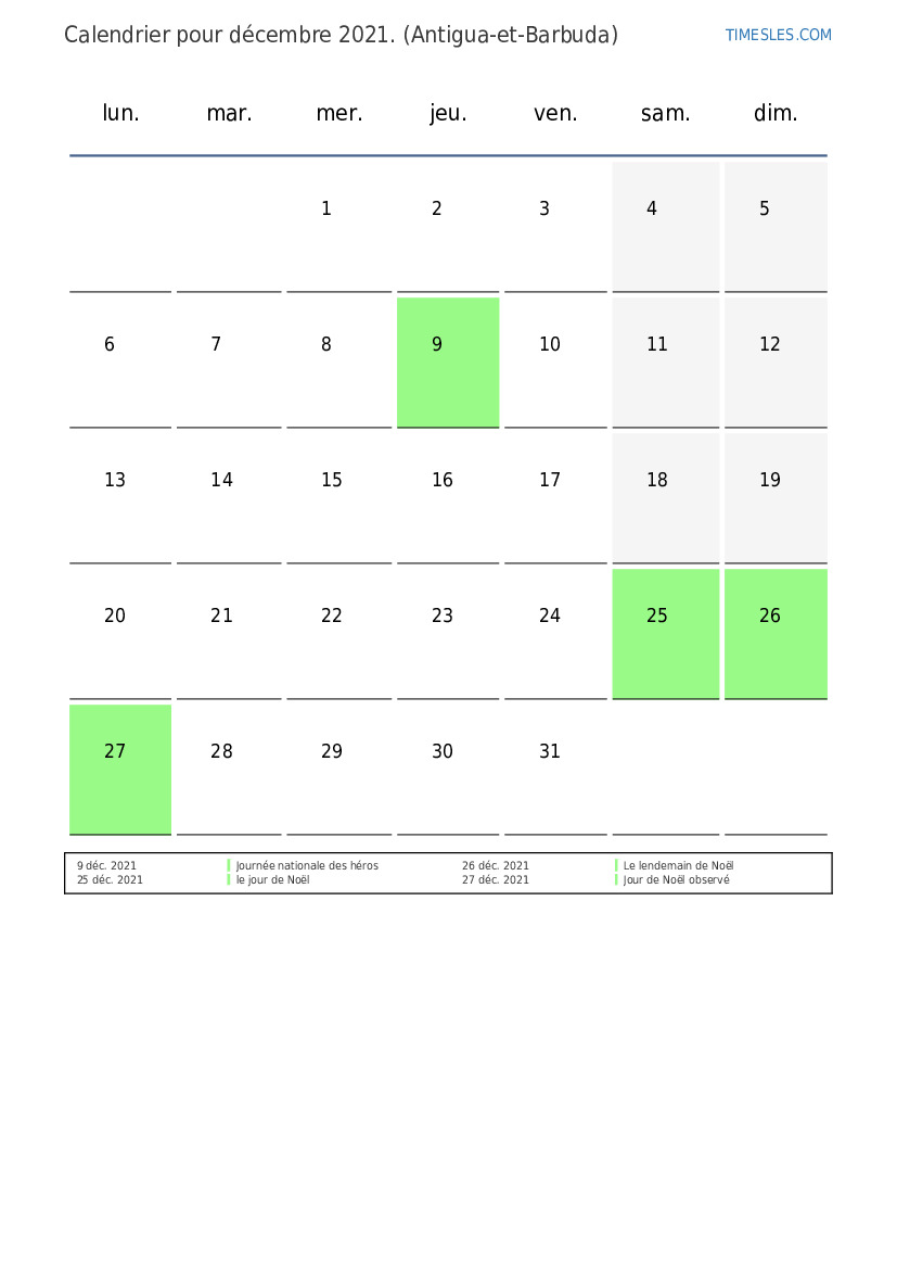 Calendrier de décembre 2021 pour Antigua et Barbuda