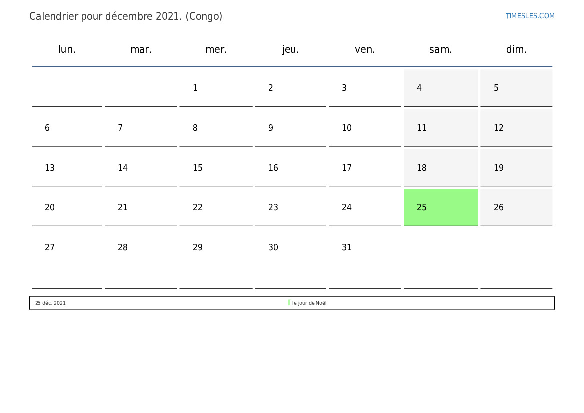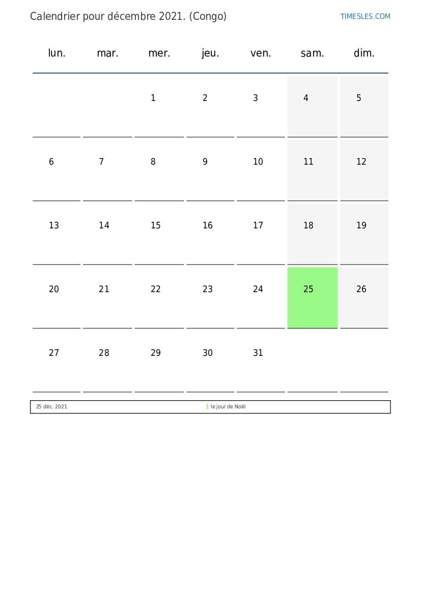 Calendrier des jours fériés et week-ends de décembre 2021 pour le Congo