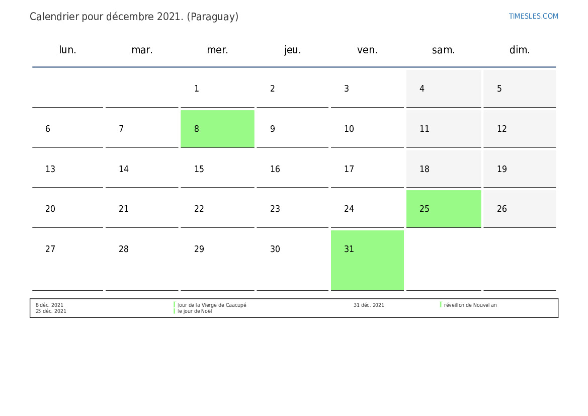 Le mois de décembre comprend 31 jours. Nous sommes au 12 mois de 2021. Saison de l'année: hiver. Le mois de janvier commence le mercredi et se termine le vendredi. Au mois de décembre 2021, il y a 5 vacances et jours de congé au Paraguay.