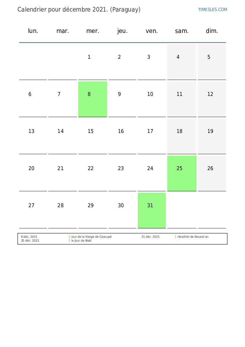 Calendrier des jours fériés et week-ends de décembre 2021 pour le Paraguay