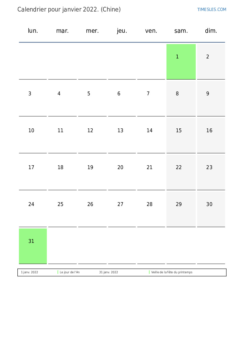 Le mois de janvier comprend 31 jours. Nous sommes au 1 mois de 2022. Saison de l'année: hiver. Le mois de janvier commence le samedi et se termine le lundi. Au mois de janvier 2022, il y a 2 vacances et jours de congé en Chine.