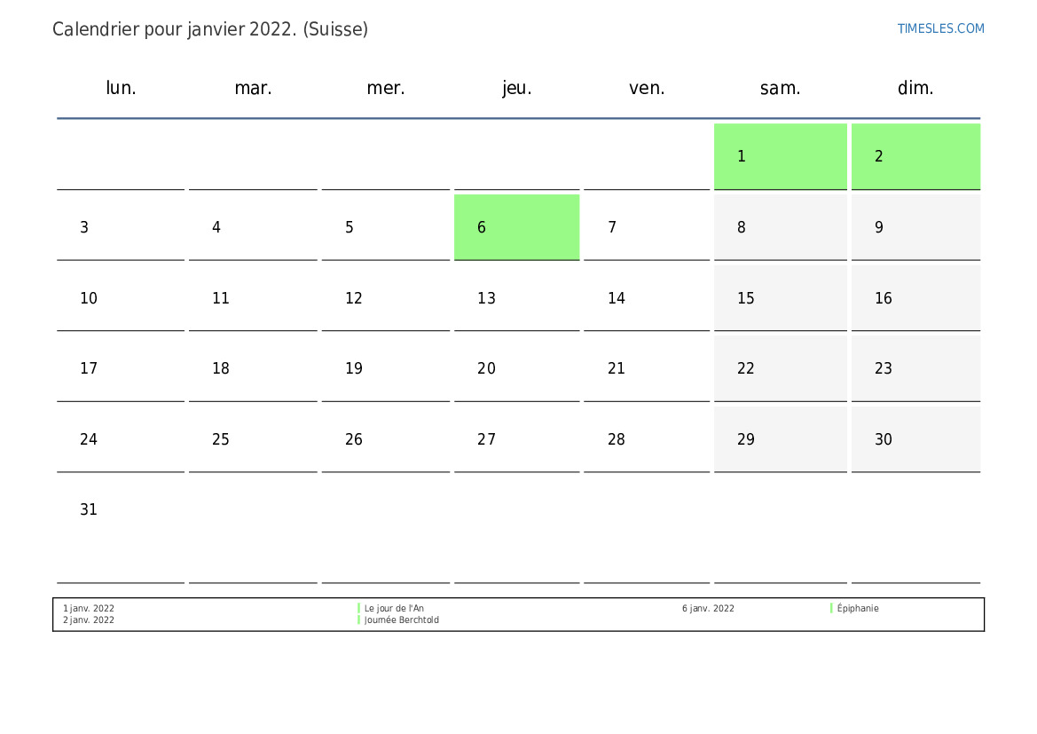 Téléchargez et imprimez le calendrier PDF avec jours fériés et week-ends de janvier 2022 pour la Suisse