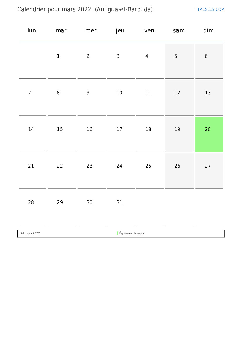 Calendrier de mars 2022 pour Antigua et Barbuda