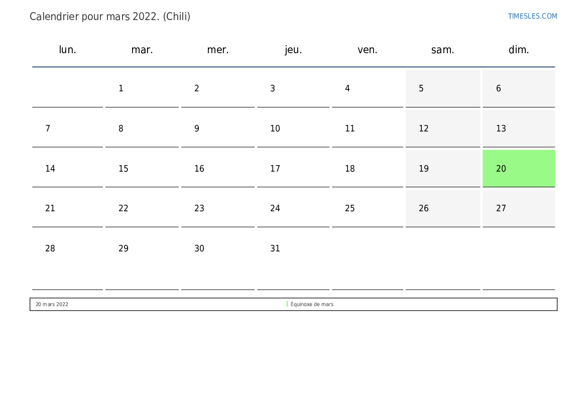 Le mois de mars comprend 31 jours. Nous sommes au 3 mois de 2022. Saison de l'année: printemps. Le mois de janvier commence le mardi et se termine le jeudi. Au mois de mars 2022, il y a 1 vacances et jour de congé au Chili.