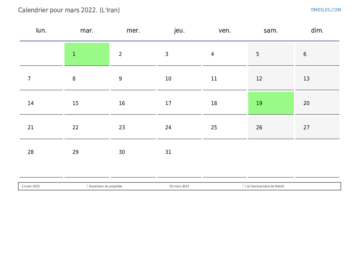 Calendrier des jours fériés et week-ends de mars 2022 pour l'Iran