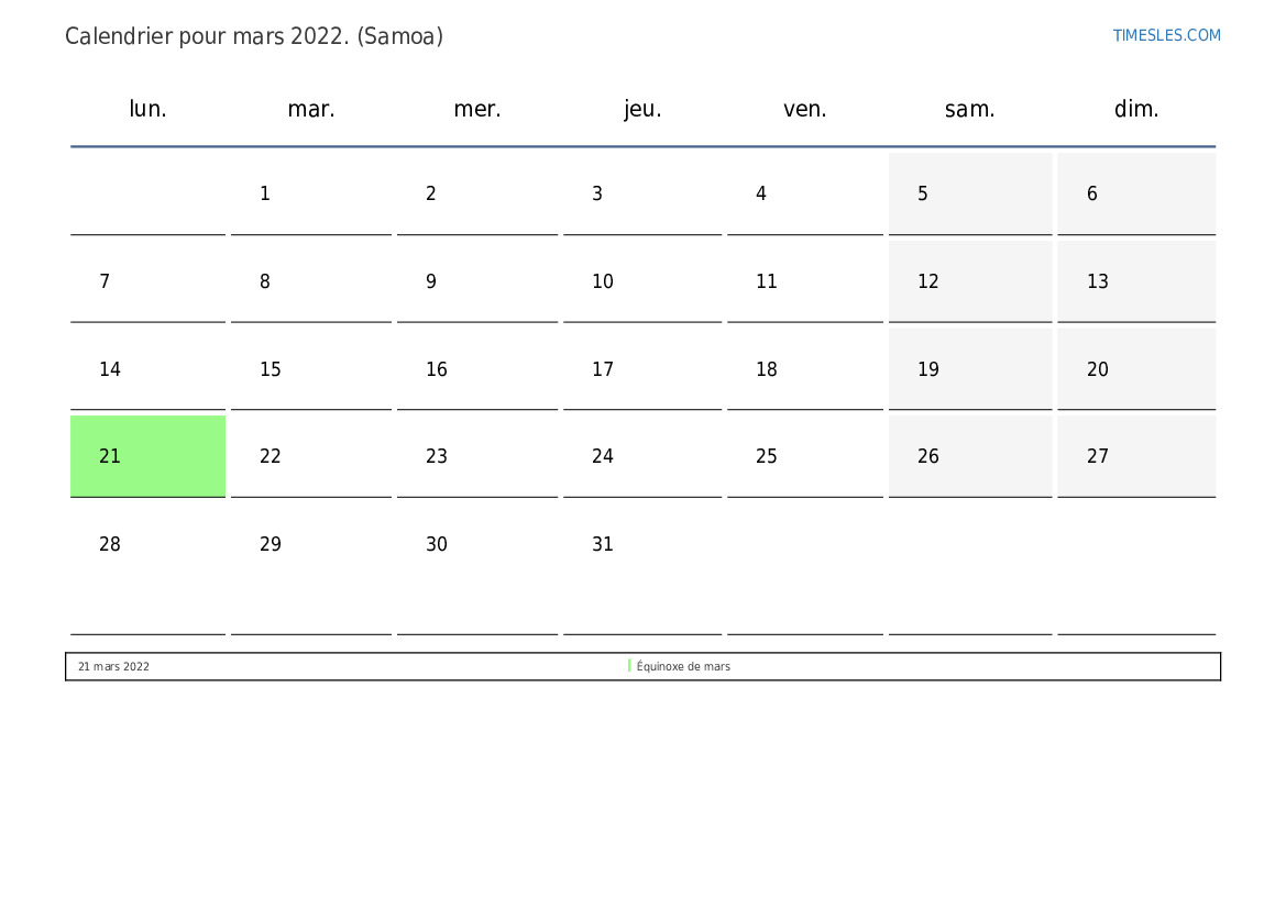 Calendrier des jours fériés et week-ends de mars 2022 pour Samoa