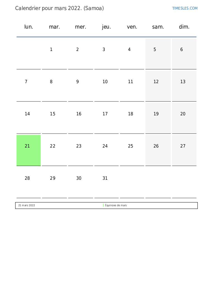 Le mois de mars comprend 31 jours. Nous sommes au 3 mois de 2022. Saison de l'année: printemps. Le mois de janvier commence le mardi et se termine le jeudi. Au mois de mars 2022, il y a 1 vacances et jour de congé aux Samoa.