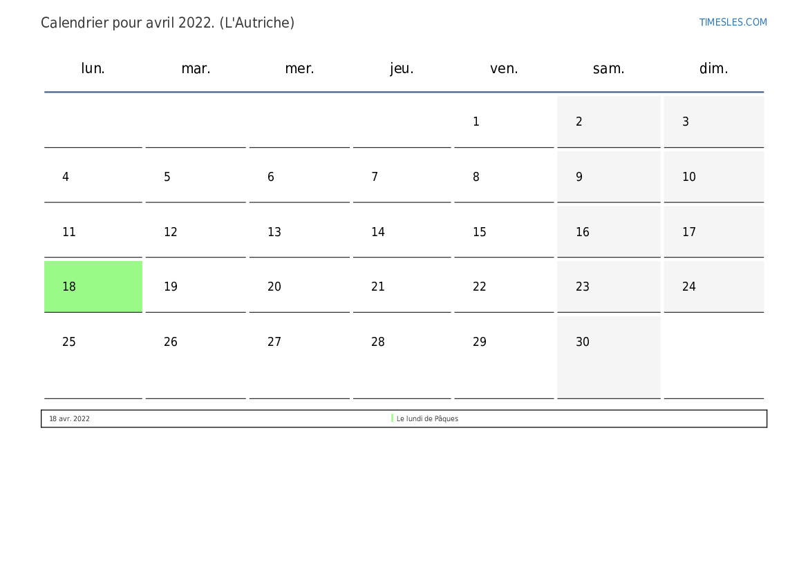 Calendrier des jours fériés et week-ends de avril 2022 pour l'Autriche