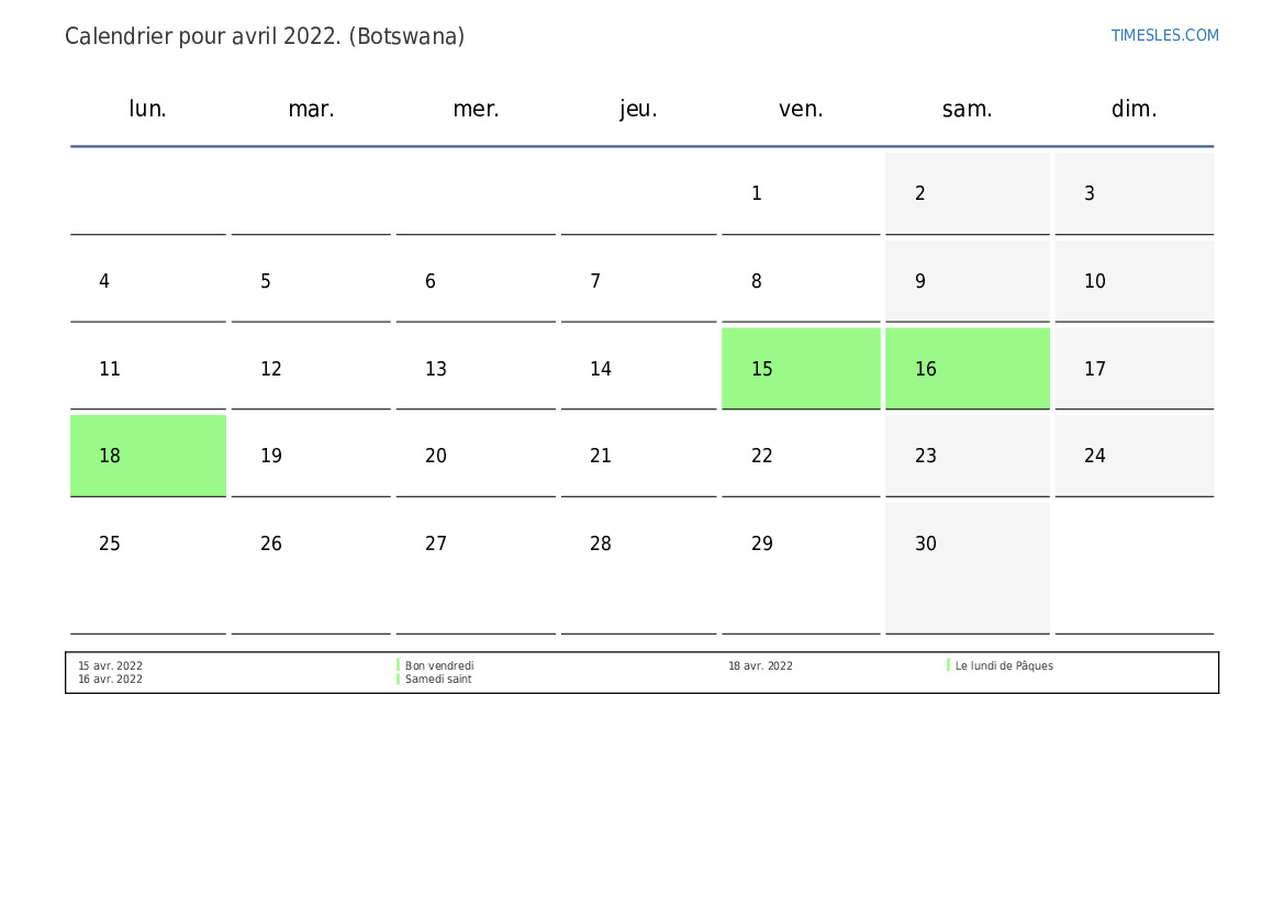 Calendrier des jours fériés et week-ends de avril 2022 pour le Botswana