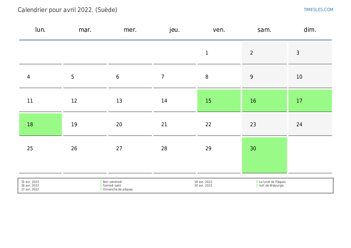 Calendrier des jours fériés et week-ends de avril 2022 pour la Suède