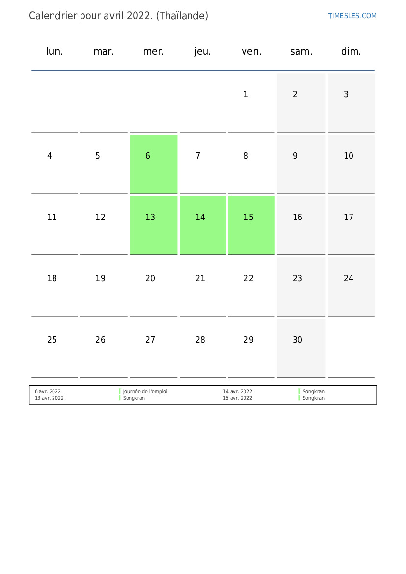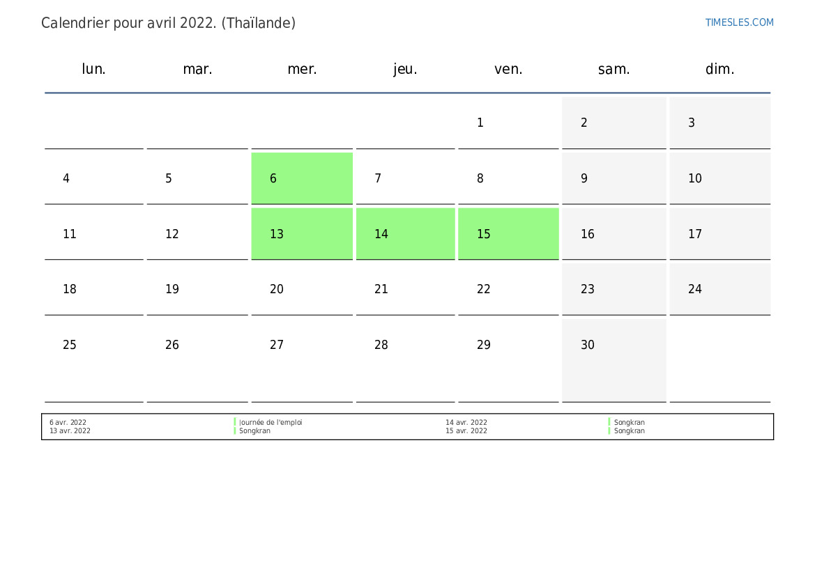 Le mois de avril comprend 30 jours. Nous sommes au 4 mois de 2022. Saison de l'année: printemps. Le mois de janvier commence le vendredi et se termine le samedi. Au mois de avril 2022, il y a 4 vacances et jours de congé en Thaïlande.