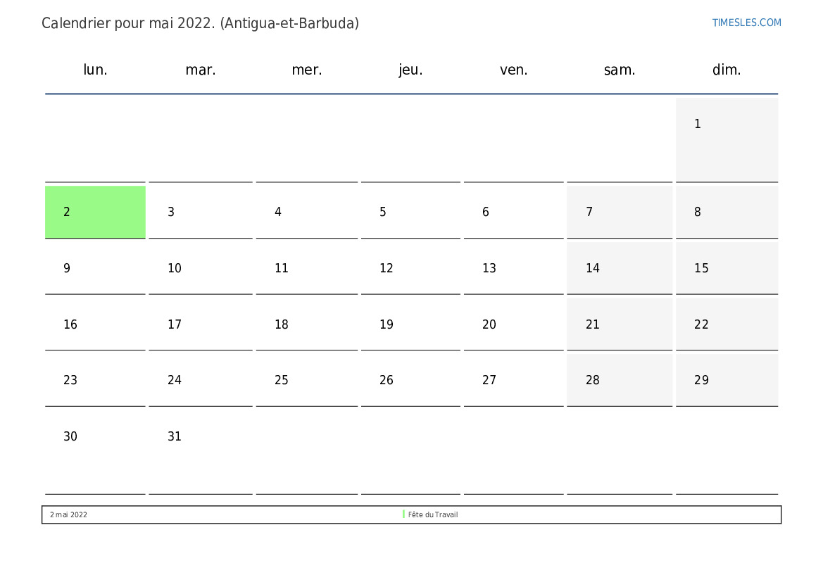 Calendrier des jours fériés et week-ends de mai 2022 pour Antigua et Barbuda