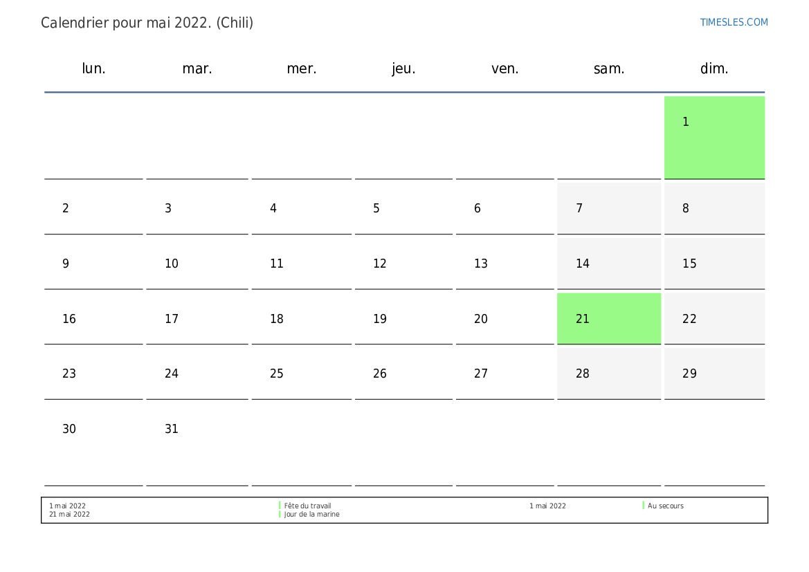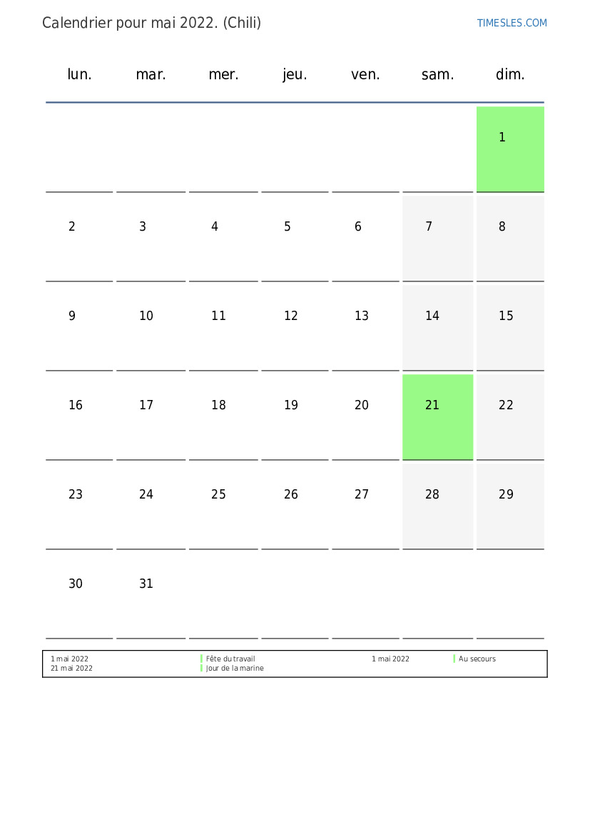 Calendrier des jours fériés et week-ends de mai 2022 pour le Chili