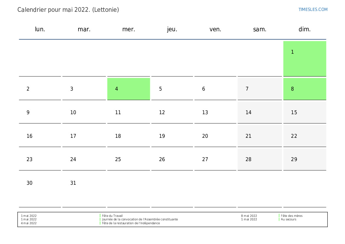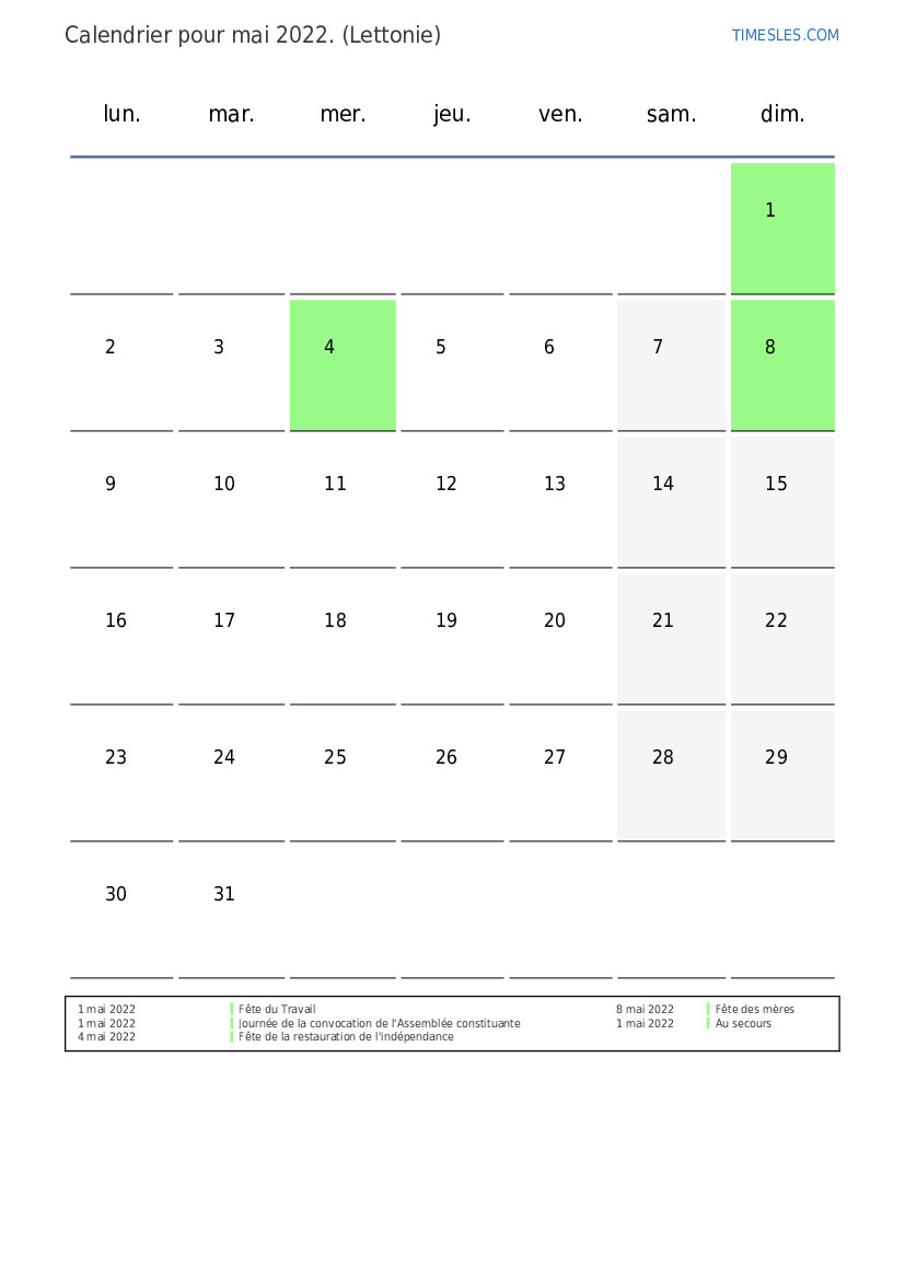 Calendrier des jours fériés et week-ends de mai 2022 pour la Lettonie