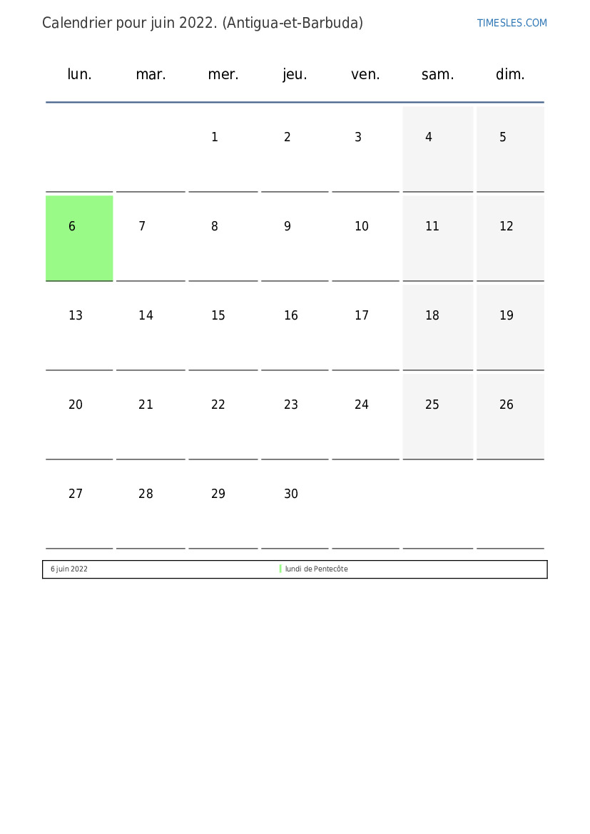 Calendrier de juin 2022 pour Antigua et Barbuda