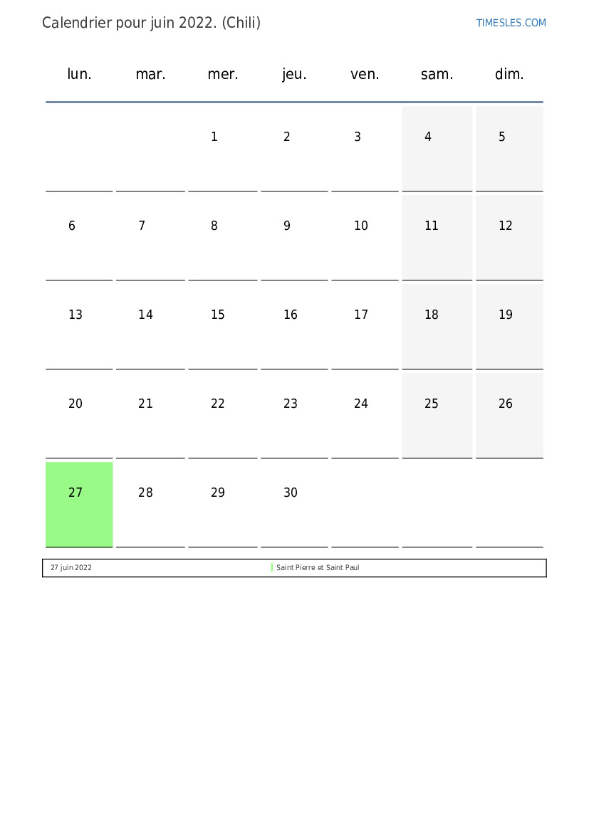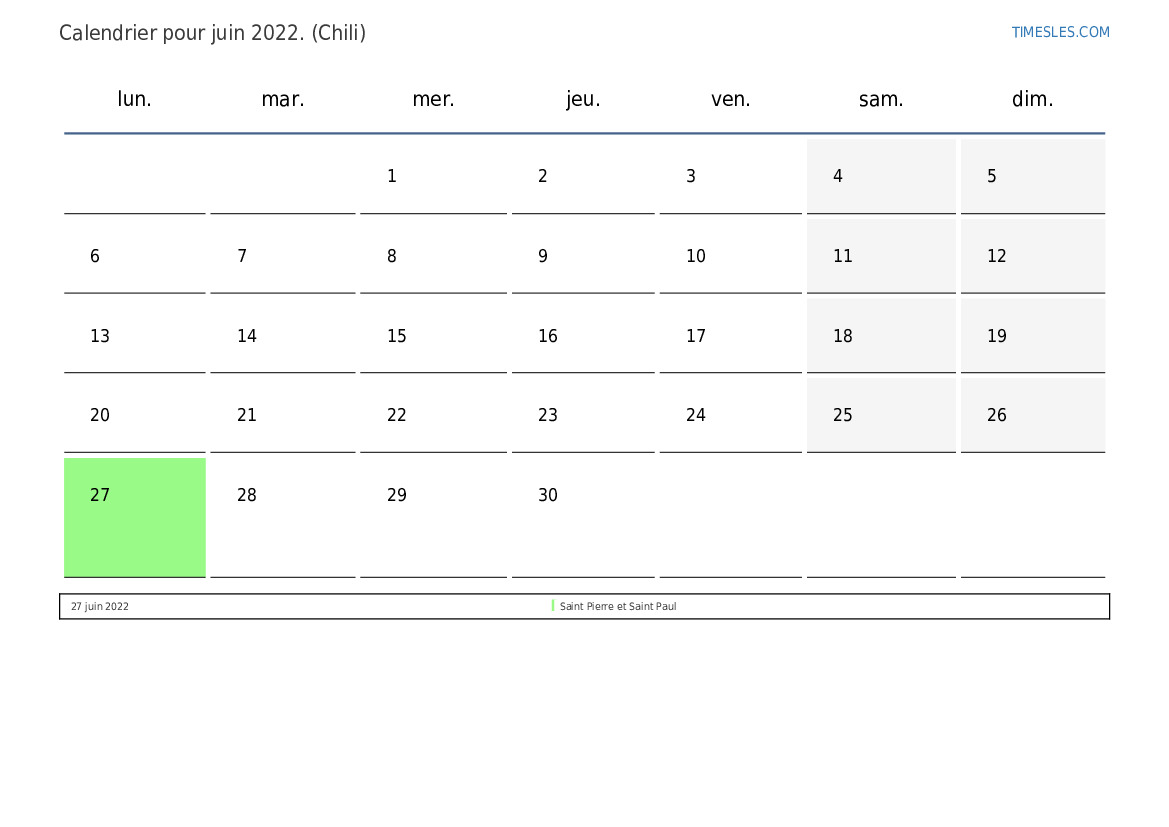 Le mois de juin comprend 30 jours. Nous sommes au 6 mois de 2022. Saison de l'année: été. Le mois de janvier commence le mercredi et se termine le jeudi. Au mois de juin 2022, il y a 3 vacances et jours de congé au Chili.