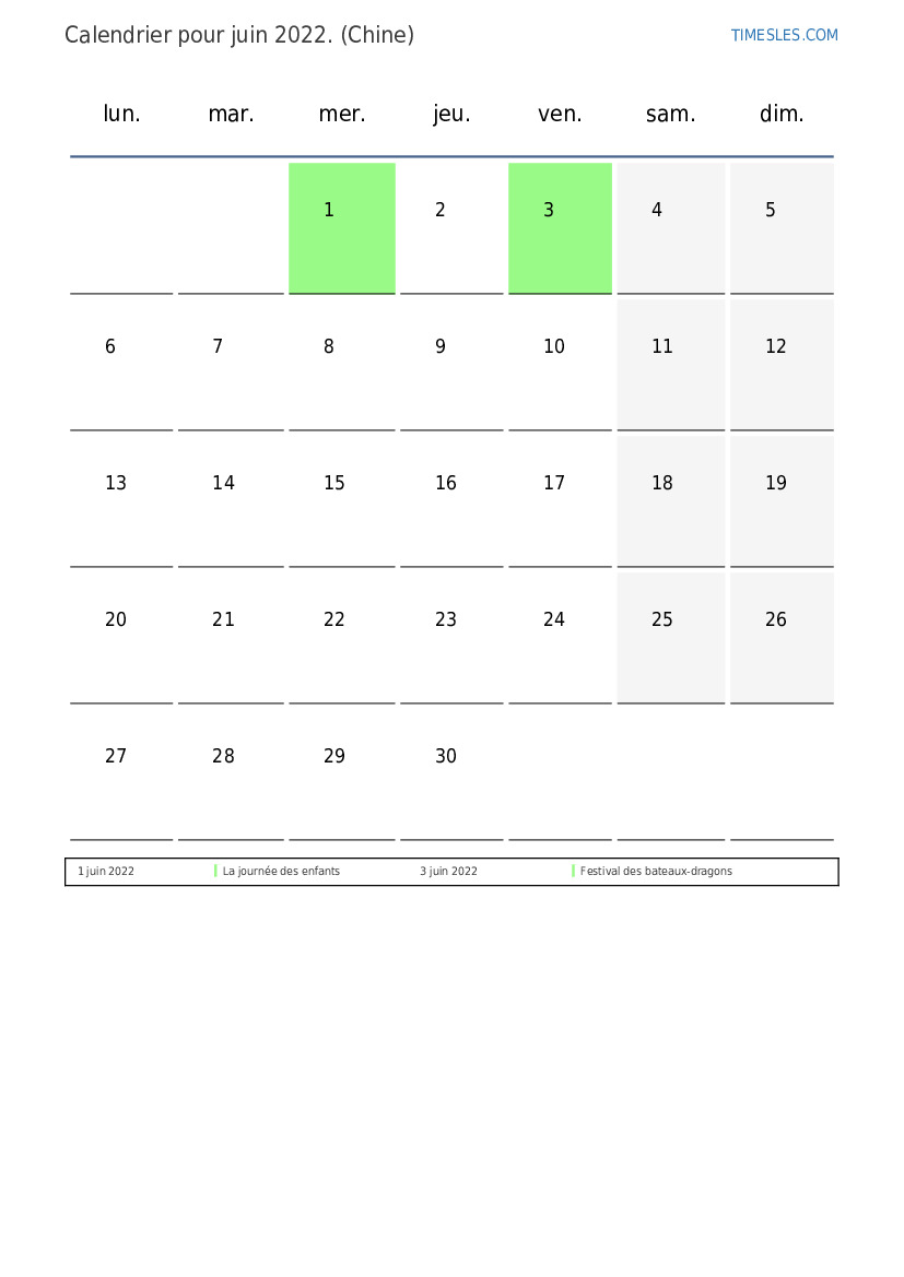 Calendrier des jours fériés et week-ends de juin 2022 pour la Chine