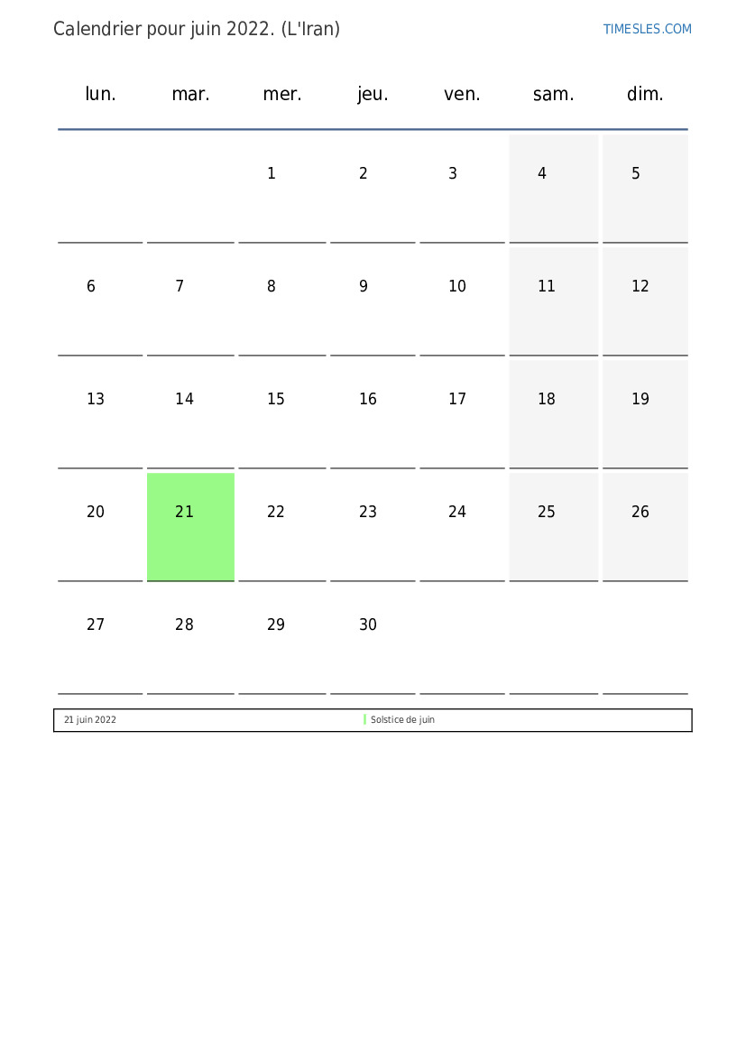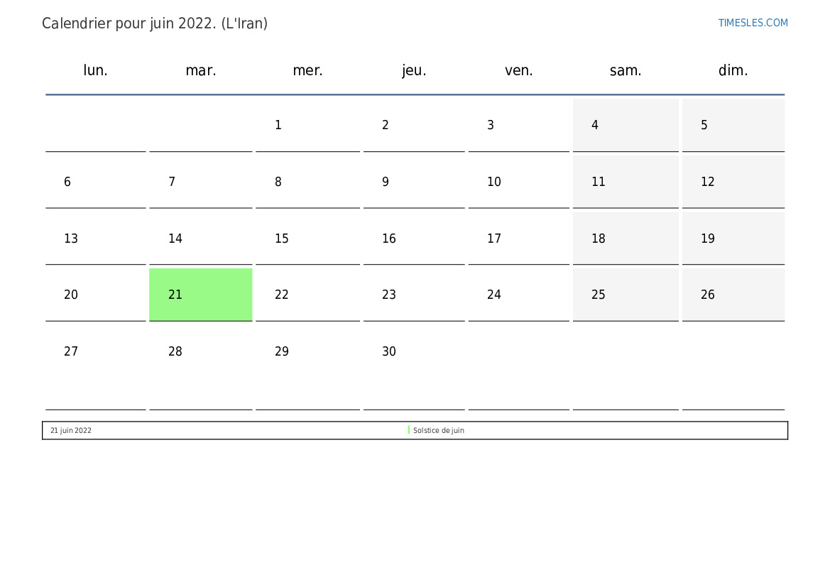 Calendrier des jours fériés et week-ends de juin 2022 pour l'Iran