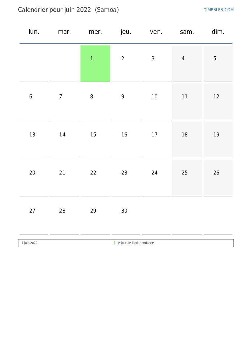 Calendrier des jours fériés et week-ends de juin 2022 pour Samoa