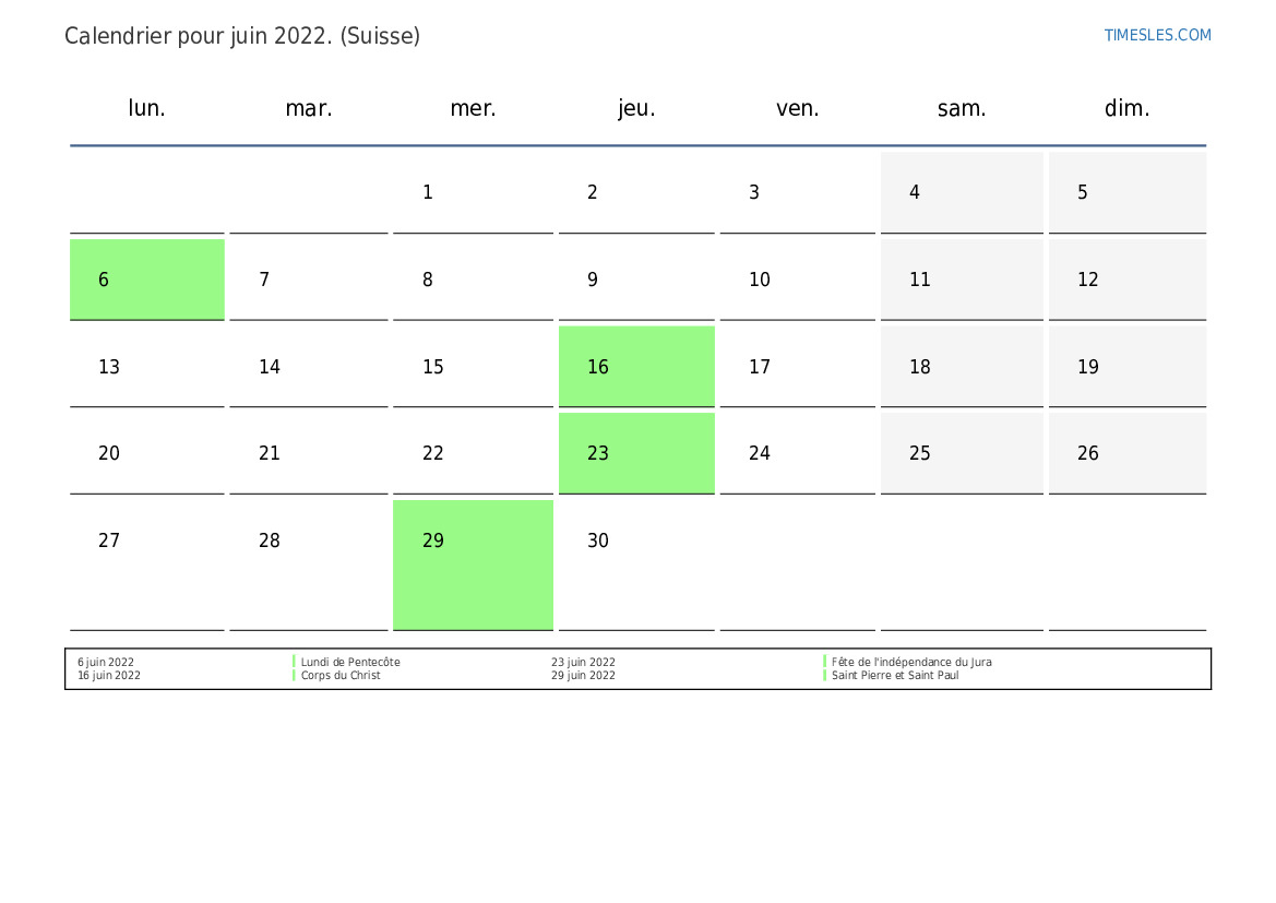 Calendrier des jours fériés et week-ends de juin 2022 pour la Suisse
