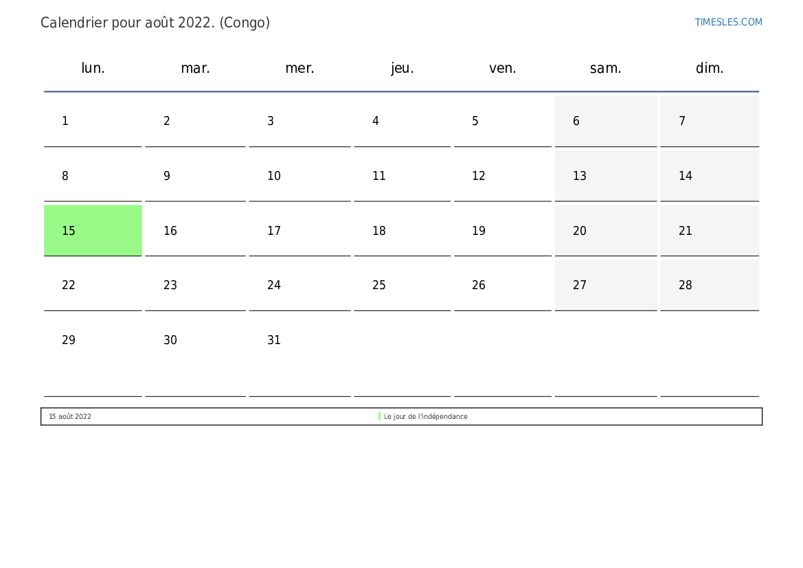 Calendrier des jours fériés et week-ends de août 2022 pour le Congo