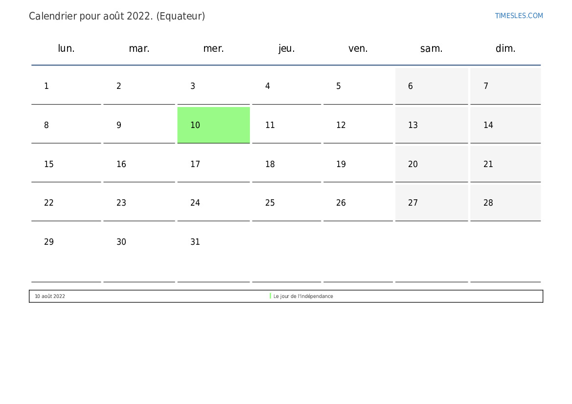Calendrier des jours fériés et week-ends de août 2022 pour l'Équateur