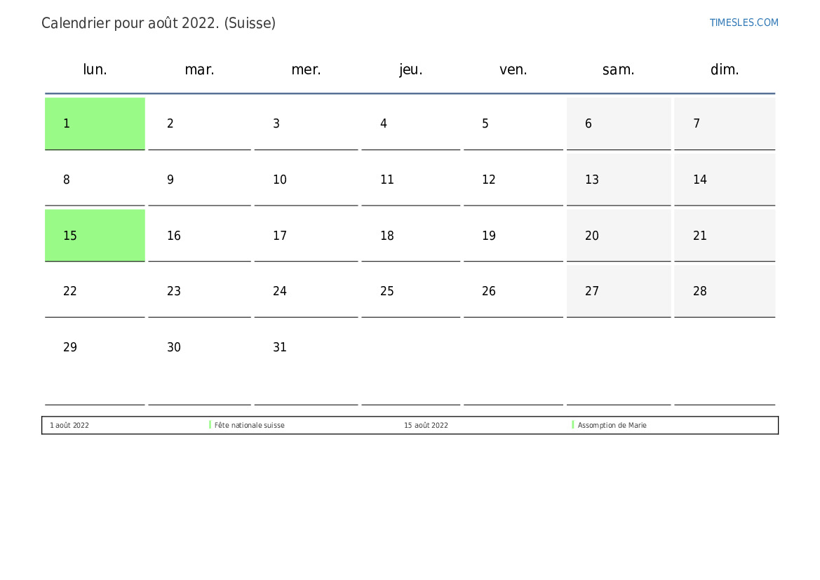 Calendrier des jours fériés et week-ends de août 2022 pour la Suisse
