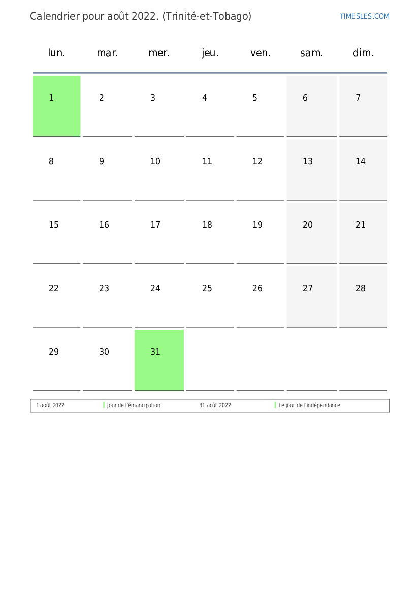 Téléchargez et imprimez le calendrier PDF avec jours fériés et week-ends de août 2022 pour Trinité-et-Tobago