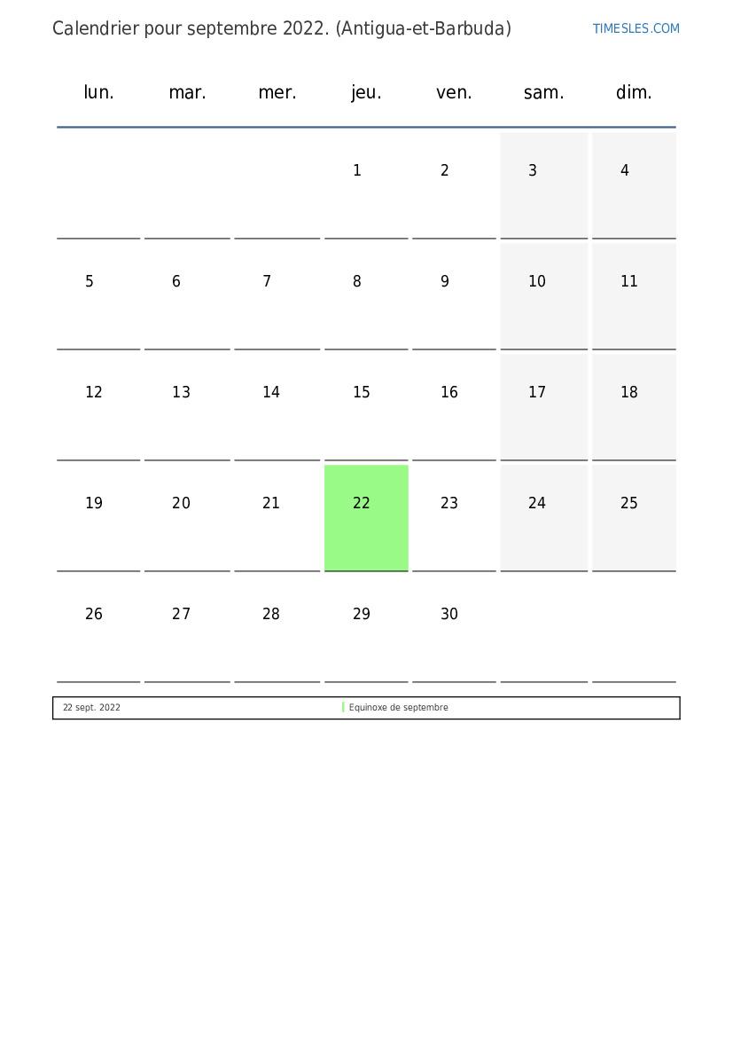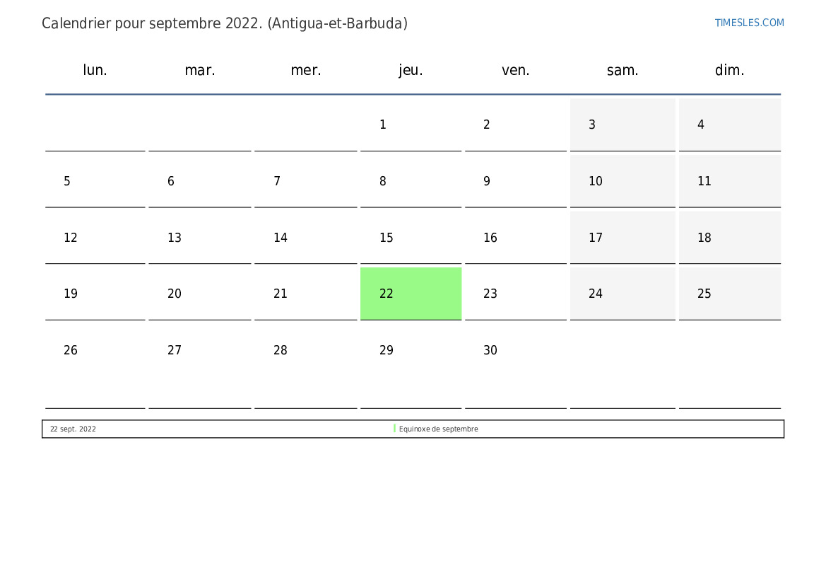 Calendrier de septembre 2022 pour Antigua et Barbuda