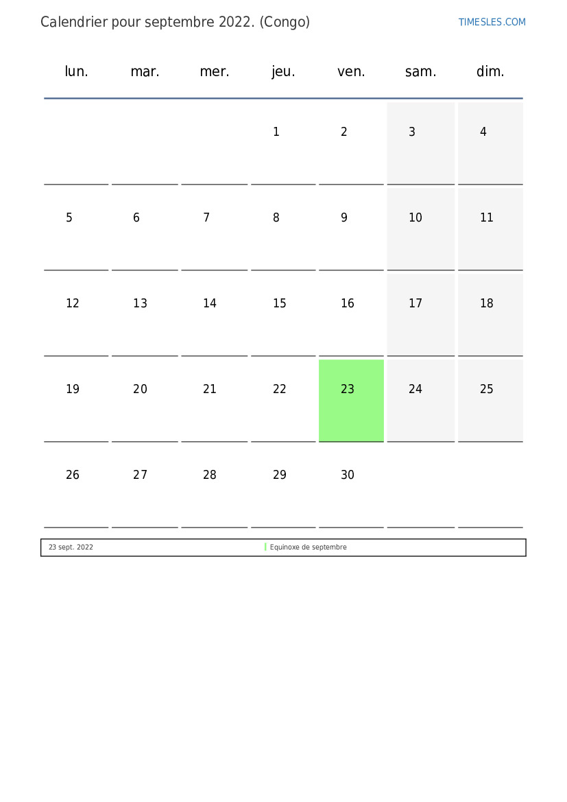 Calendrier des jours fériés et week-ends de septembre 2022 pour le Congo