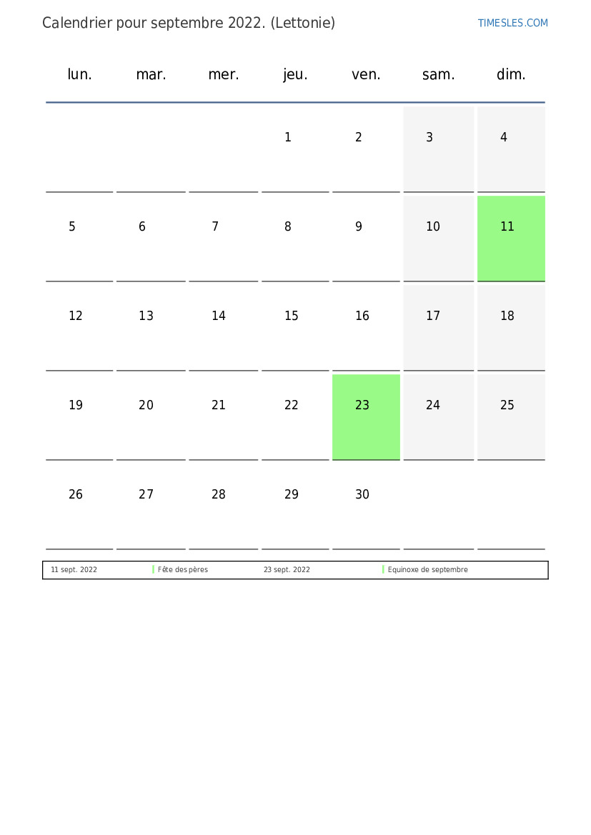 Calendrier des jours fériés et week-ends de septembre 2022 pour la Lettonie