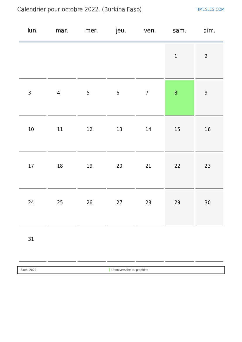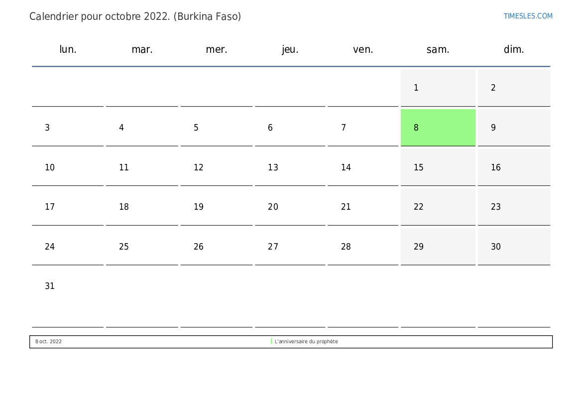 Calendrier des jours fériés et week-ends de octobre 2022 pour le Burkina Faso