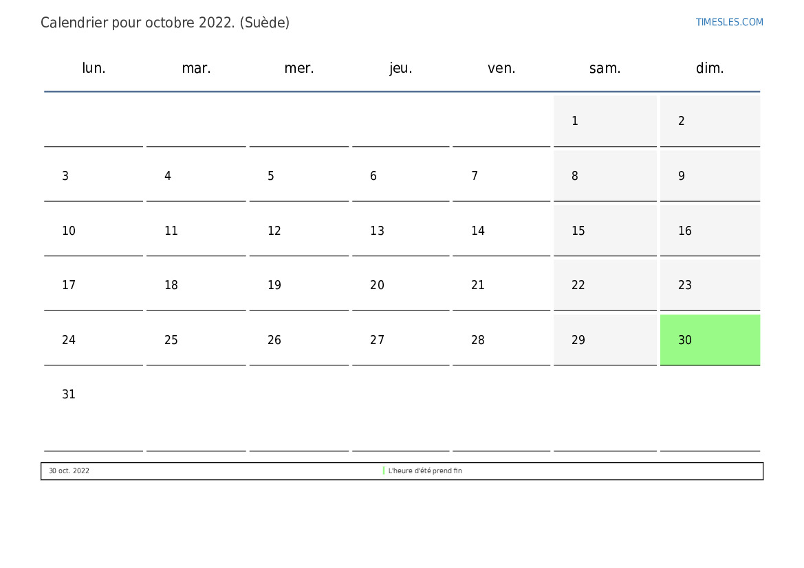 Calendrier des jours fériés et week-ends de octobre 2022 pour la Suède