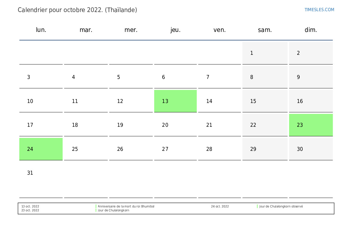 Calendrier des jours fériés et week-ends de octobre 2022 pour la Thaïlande