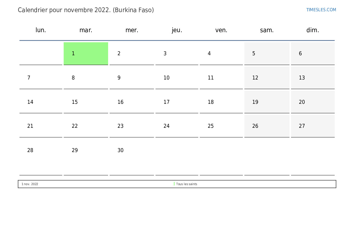Calendrier des jours fériés et week-ends de novembre 2022 pour le Burkina Faso