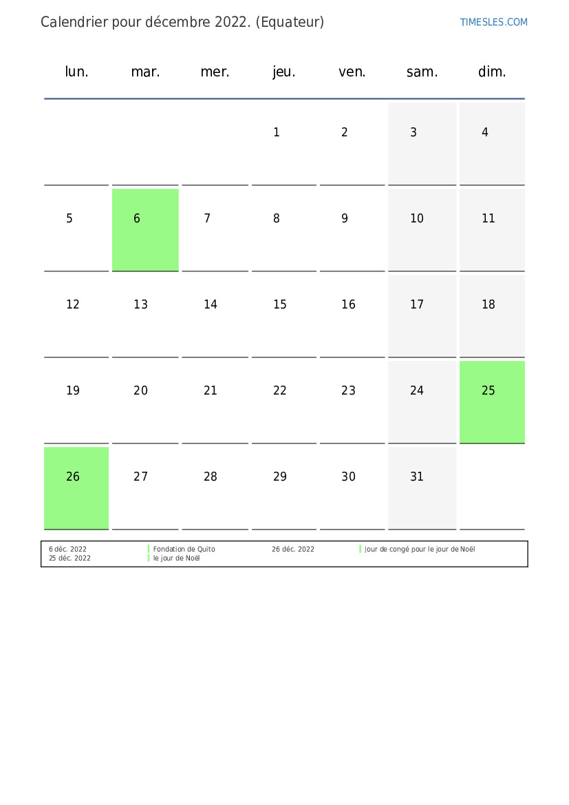 Calendrier des jours fériés et week-ends de décembre 2022 pour l'Équateur