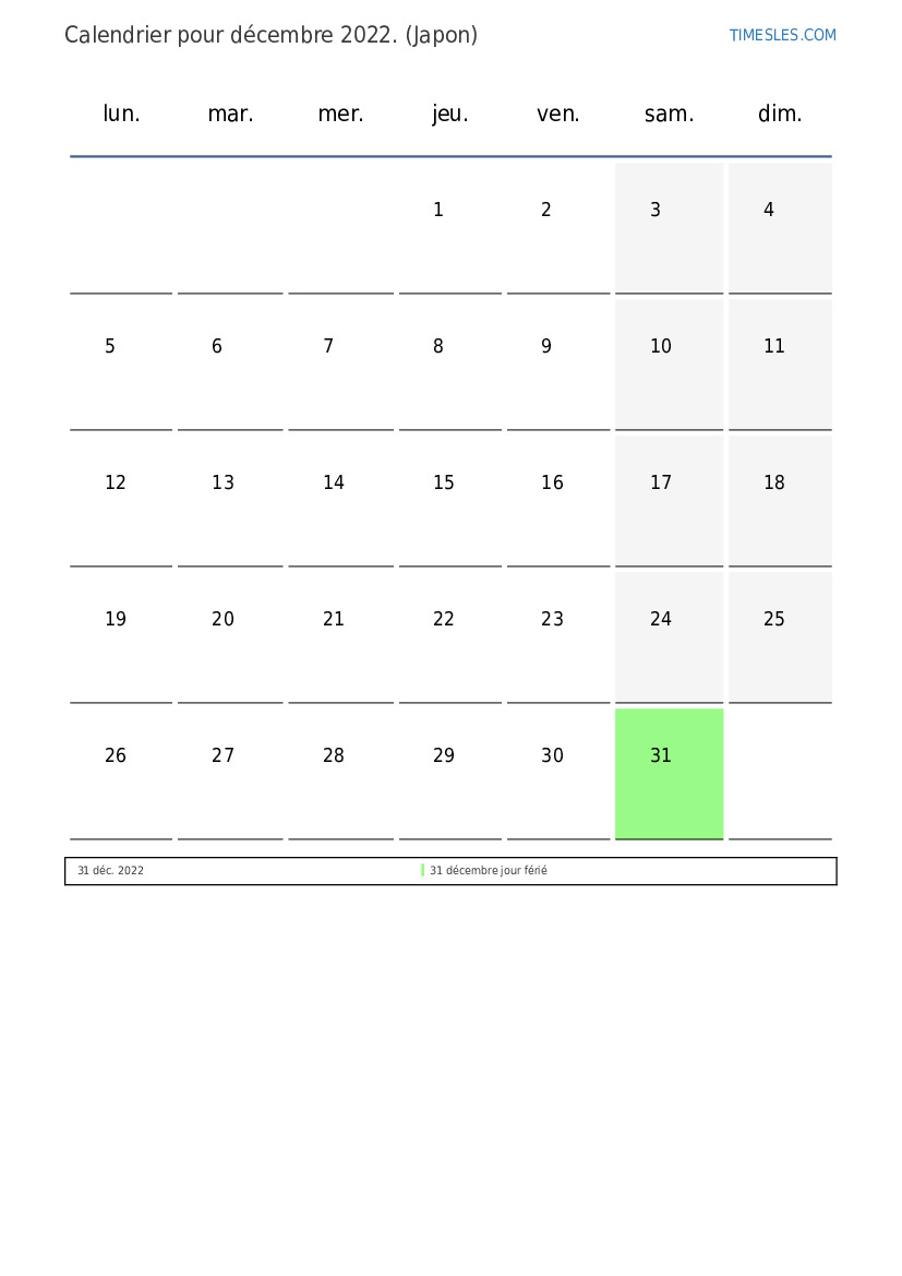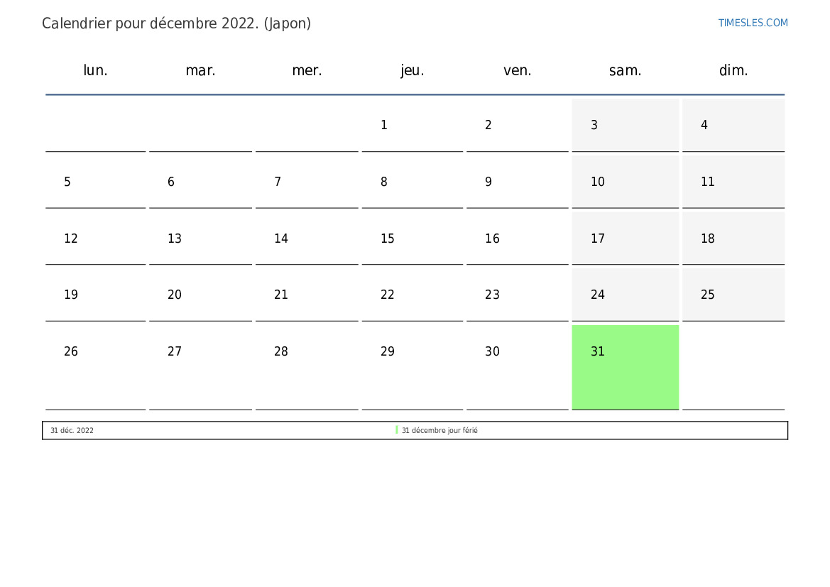 Le mois de décembre comprend 31 jours. Nous sommes au 12 mois de 2022. Saison de l'année: hiver. Le mois de janvier commence le jeudi et se termine le samedi. Au mois de décembre 2022, il y a 3 vacances et jours de congé au Japon.