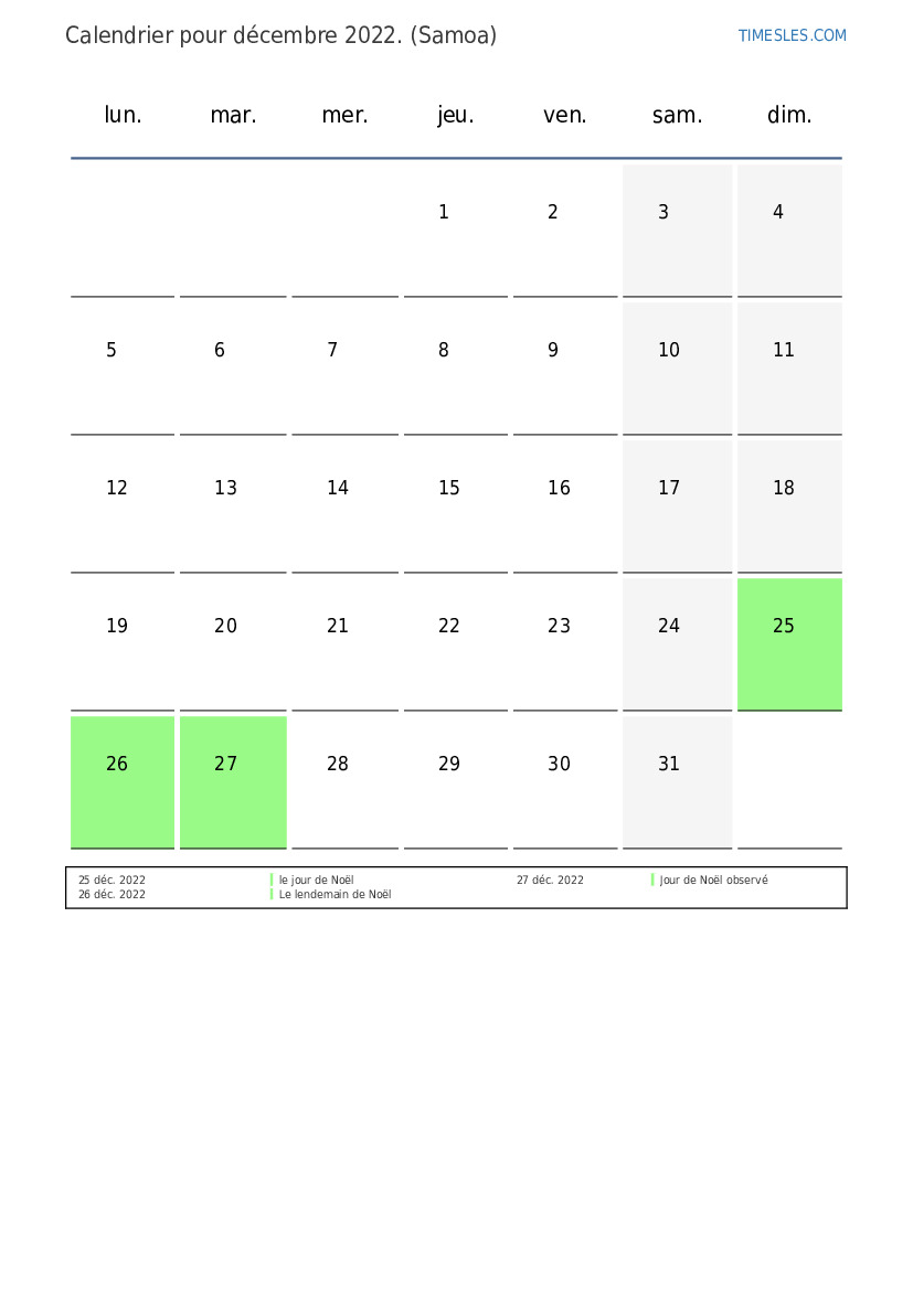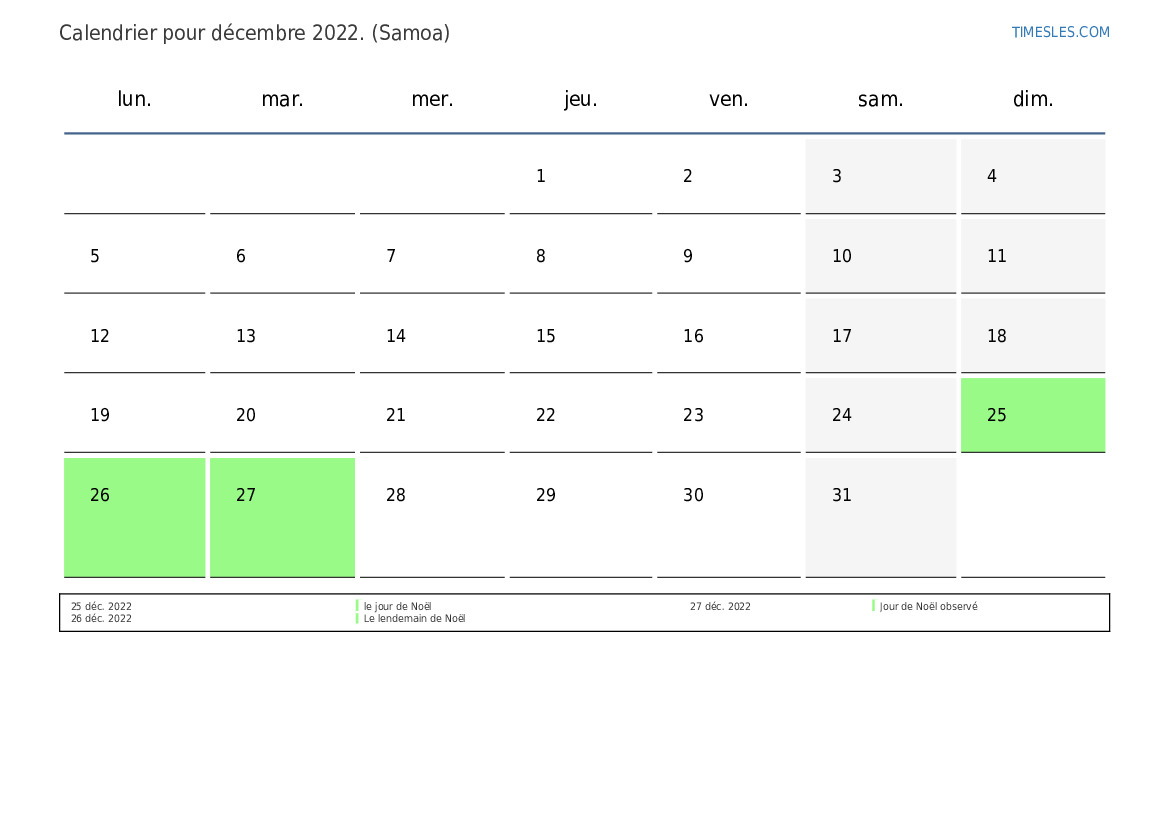 Calendrier des jours fériés et week-ends de décembre 2022 pour Samoa