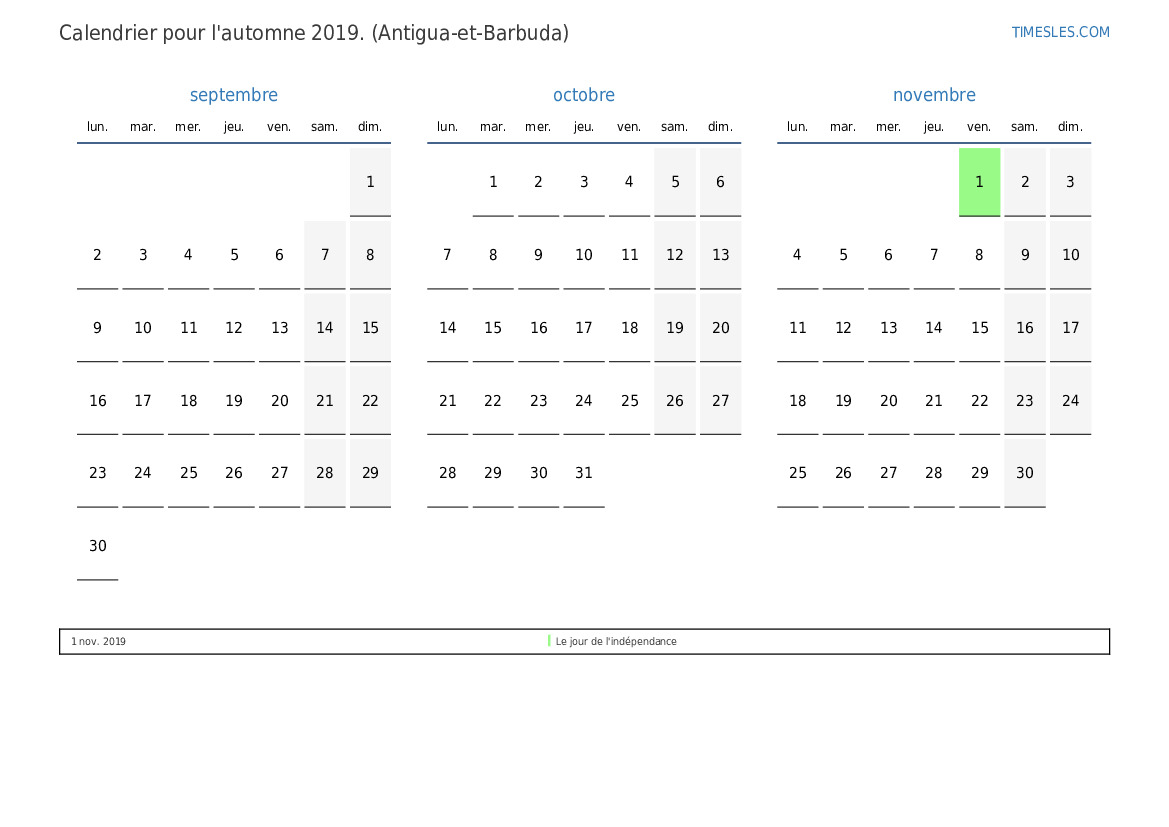 Téléchargez et imprimez le calendrier PDF avec les jours fériés et les week-ends pour l'automne 2019 pour Antigua et Barbuda