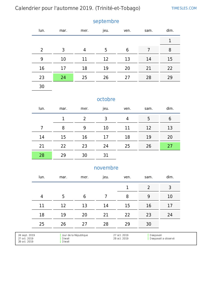 Téléchargez et imprimez le calendrier PDF avec les jours fériés et les week-ends pour l'automne 2019 pour Trinité-et-Tobago
