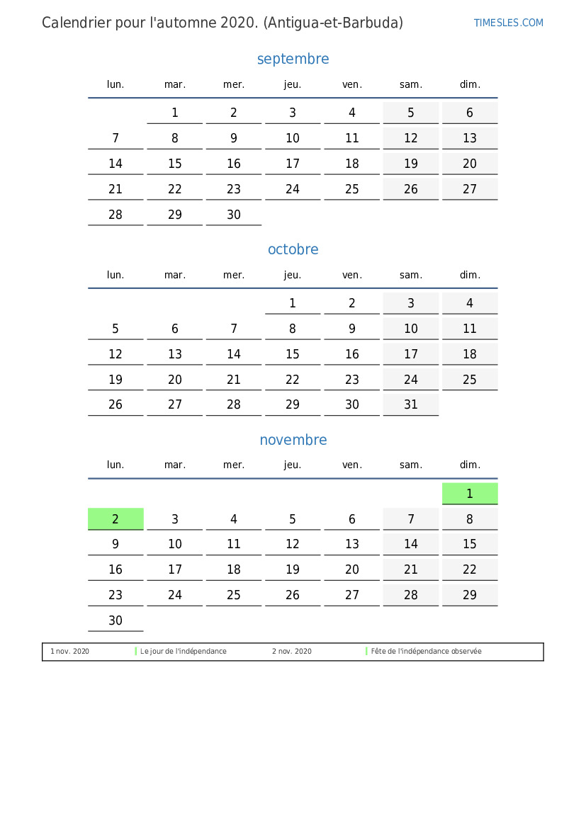 Téléchargez et imprimez le calendrier PDF avec les jours fériés et les week-ends pour l'automne 2020 pour Antigua et Barbuda