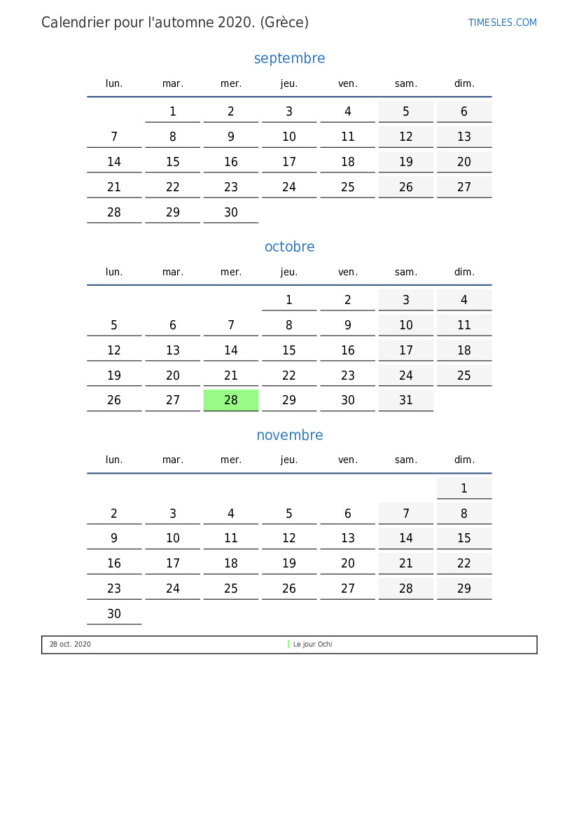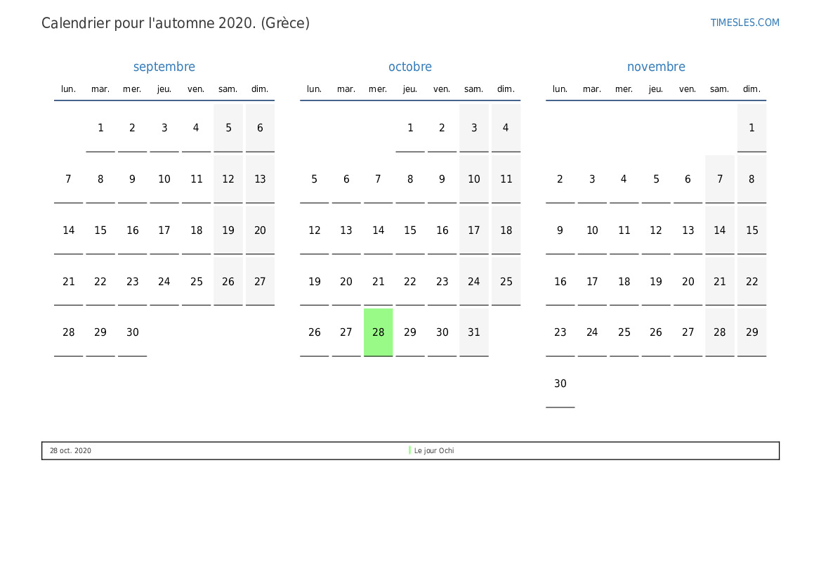 Calendrier des jours fériés et des week-ends pour l'automne 2020 pour la Grèce