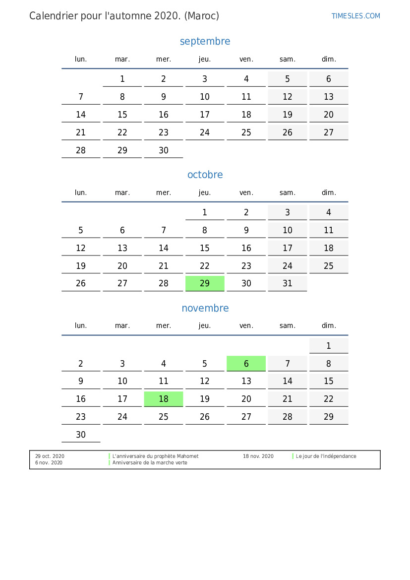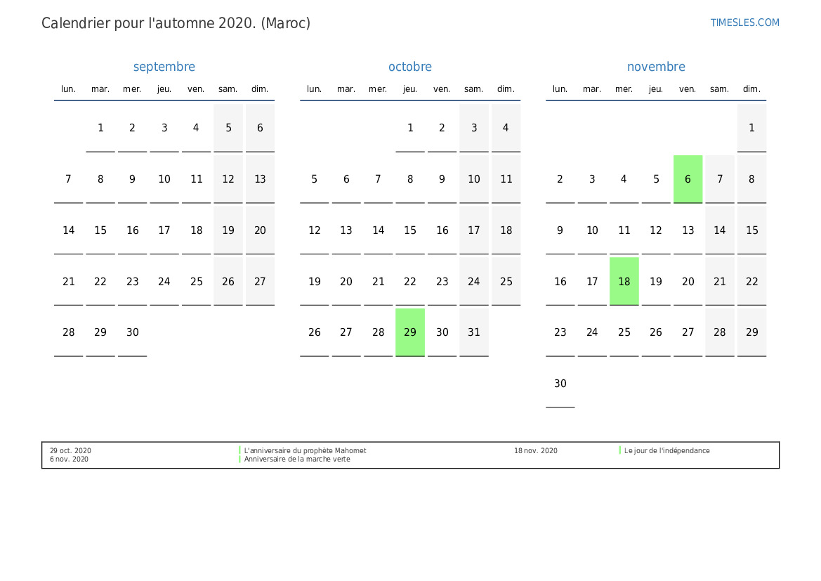 Téléchargez et imprimez le calendrier PDF avec les jours fériés et les week-ends pour l'automne 2020 pour le Maroc