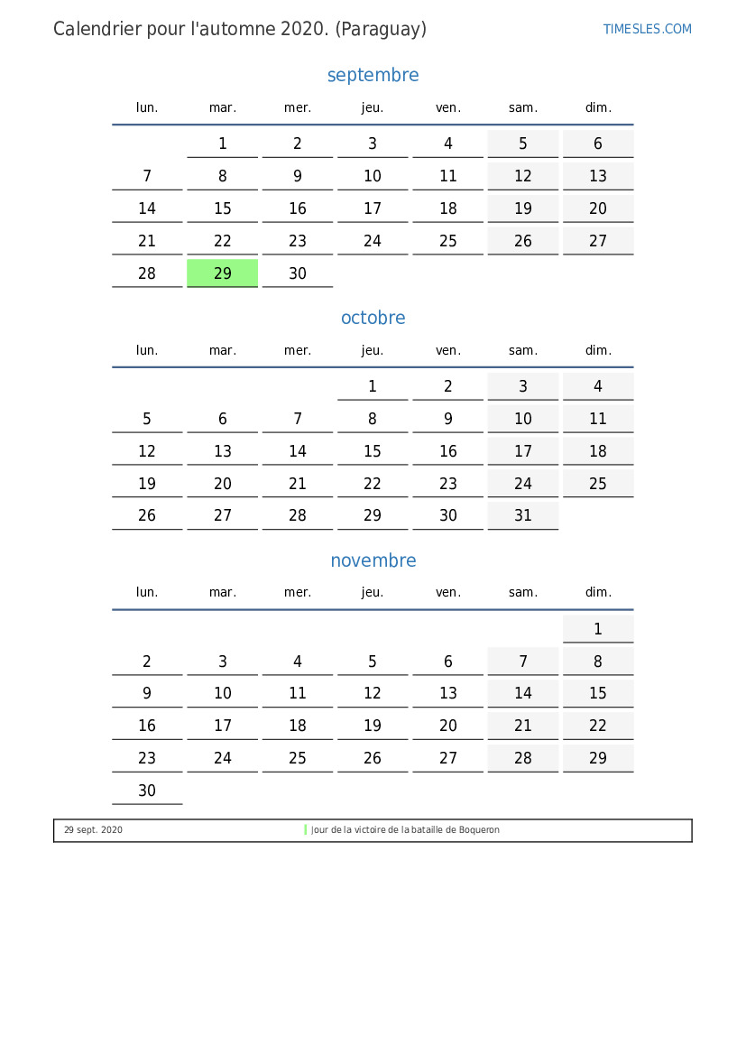 Téléchargez et imprimez le calendrier PDF avec les jours fériés et les week-ends pour l'automne 2020 pour le Paraguay
